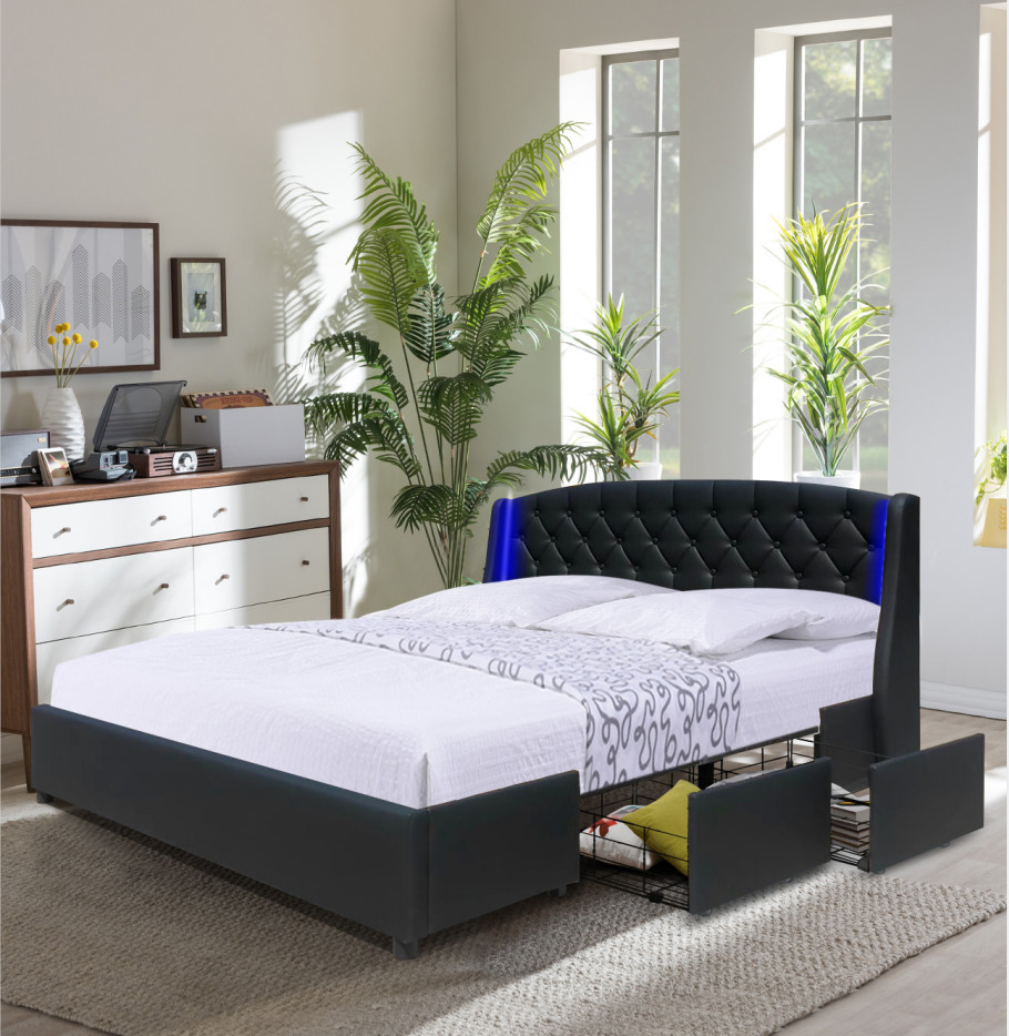 Name : Tufted Buttons Balck Faux Leather King Size Drawer Storage Bed With Led On Two Ears